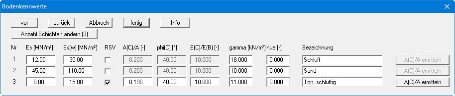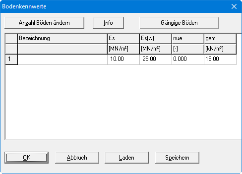 In der obigen Dialogbox können Sie Namen, Steifemodule für Erst- und Wiederbelastung, Querkontraktionszahl und Wichten der einzelnen Bodenschichten eingeben. Über den Knopf