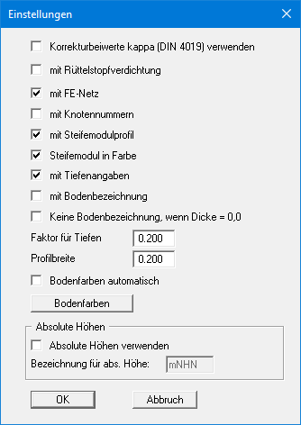 liegen sollten. Mit diesen Koordinaten ist sichergestellt, dass alle Knoten der Platte erfasst werden. Sie können über den Menüeintrag "Blatt / Koordinaten neu berechnen" oder am einfachsten über die Funktionstaste [F9] eine bildschirmfüllende Darstellung erreichen, wenn die gewünschten Punkte außerhalb der Darstellung liegen. Parallel zur Eingabe mit der Maus werden die Bohrpunkte (Steifemodulprofile) dargestellt. Die Profile wirken etwas klobig im Verhältnis zur Platte. Korrigieren Sie, wenn gewünscht, die Optik, indem Sie den Menüeintrag "Steifemodul / Einstellungen" wählen und Folgendes eingeben: