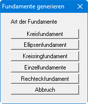 Es besteht die Möglichkeit, Fundamente automatisch vom Programm generieren zu lassen. Dazu wählen Sie in der folgenden Dialogbox zunächst die gewünschte Fundamentart aus: