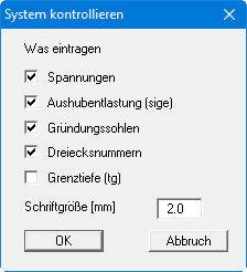 Über diesen Menüeintrag oder alternativ nach Klicken auf die Funktionstaste [F8] können Sie Ihre Eingabedaten für die Fundamentknotenkontrollieren. Was in der Grafik dargestellt werden soll, können Sie durch Aktivieren der Schalter in der Dialogbox festlegen.