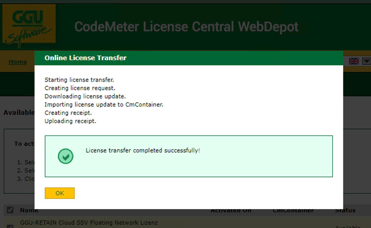 Starten Sie den Ticket-Link auf Ihrem CodeMeter-Lizenzserver direkt aus Ihrer E-Mail heraus oder durch Kopieren in Ihren Internetbrowser. Es öffnet sich die zugehörige Seite im "CodeMeter License Central WebDepot". Sie sehen die GGU-Lizenzen angezeigt, die Sie über dieses Ticket einspielen können, (im nachfolgenden Bild die Lizenz für das Programm GGU-RETAIN.
