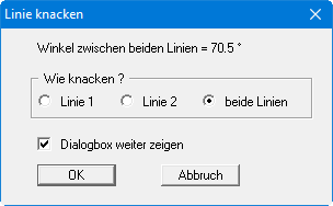 Aktivieren Sie das Symbol "Linien knacken" und klicken nacheinander die zu knackenden Linien an. Die erste wird zunächst durch schwarze Kästchen am Linienende markiert. Beim Anklicken der zweiten Linie erhalten Sie die folgende Dialogbox: